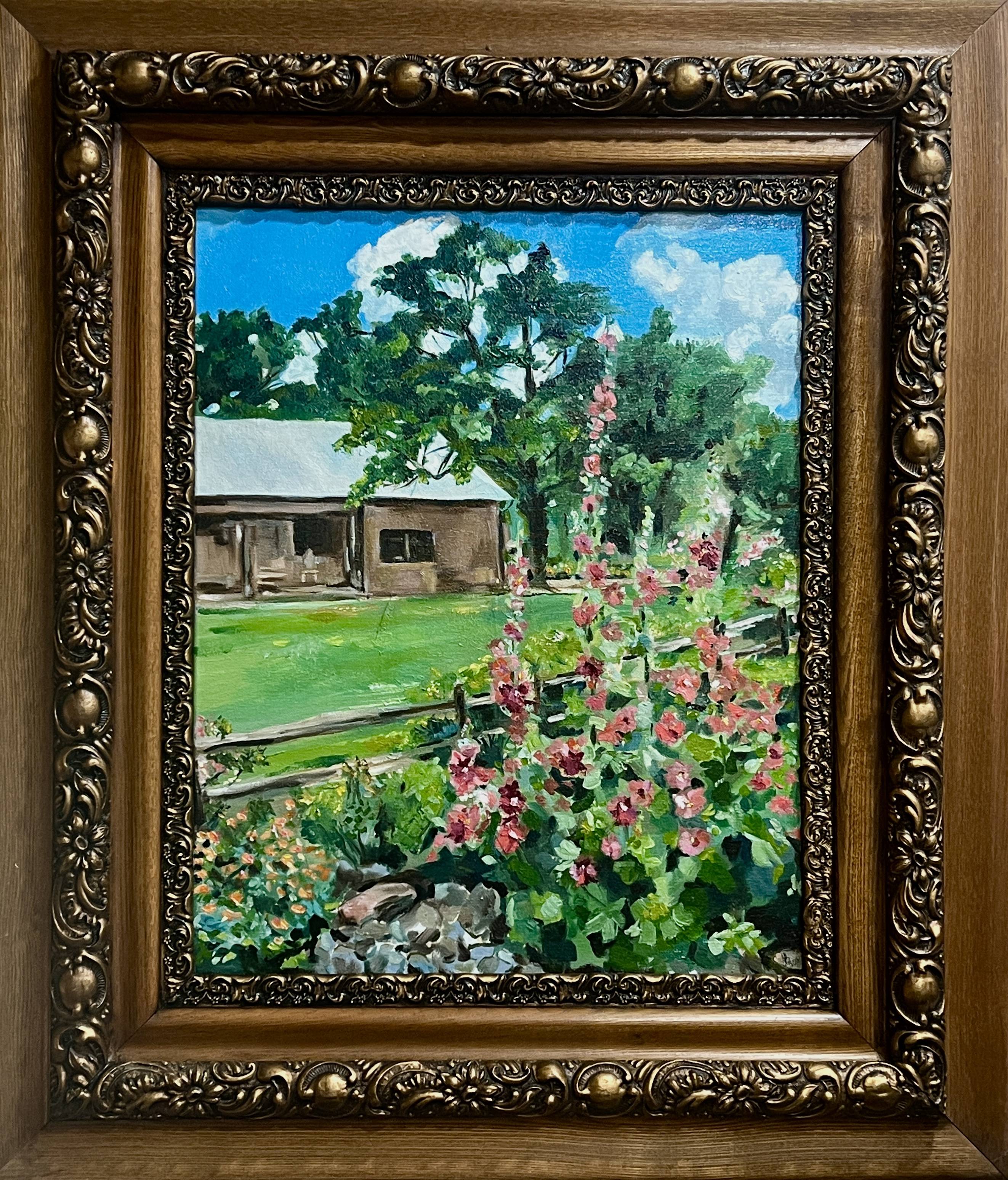 Hollyhocks have long been an artist's favorite. Their dramatic coloring and towering presence make for a beautiful composition. They have stirred the imagination of many painters in the beautiful Land of Enchantment. This painting (oil on canvas) was created in the inspiring garden of Mr. and Mrs. Gary Dearth, in Corrales, New Mexico. The artist, while visiting his friends, was so inspired that a painting soon appeared on the canvas.